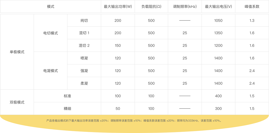 本手术设备的单极模式包含单极电切和单极电凝模式;双极模式包含标准和精细,输出功率均可调。