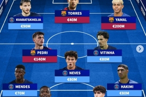 体育资讯10月1日讯 本轮欧冠迎来巴萨与巴黎的强强较量。德转也盘点了两支球队目前身价最高11人阵容,具体如下: