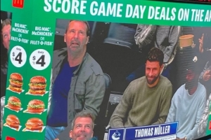 穆勒受邀观看温哥华加人队的冰球比赛,并被现场大屏幕介绍。