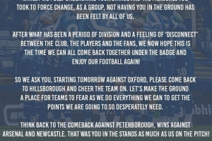 所以我们请求你们,从明天对阵牛津联的比赛开始,请回到希尔斯堡球场为球队加油助威。让我们把这座球场变成客队恐惧的地方,因为我们将竭尽所能去争取我们如此迫切需要的积分。