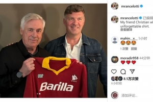 安切洛蒂获赠自己效力罗马期间的球衣,他在社交媒体上晒照:“我的朋友克里斯蒂安收藏了一件令人难忘的球衣。”