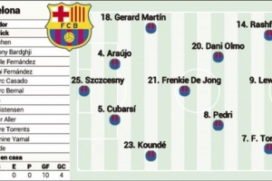 在边路,一切迹象表明孔德和马丁将会首发,而巴尔德则蓄势待发,等待获得一些出场时间。与巴尔德情况类似的是亚马尔,他将在缺席一个月后于本周回归。原则上,在拉菲尼亚缺阵后,弗里克开局将押注于由拉什福德、莱万多夫斯基和费兰-托雷斯组成的锋线三叉戟。